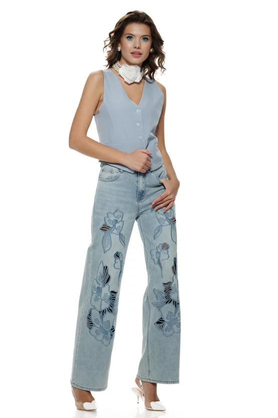 Croiul larg pe picior oferă lejeritate și alungește silueta, în timp ce detaliile brodate creează un efect sofisticat, perfect pentru femeia modernă care își dorește piese unice și expresive. Nuanța de bleu deschis, ușor prespălată, adaugă un aer fresh și feminin.
