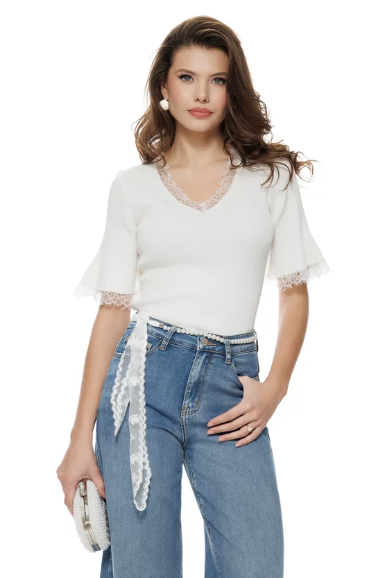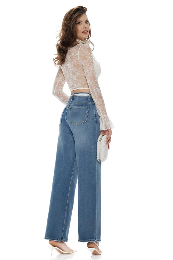 Un mix perfect între casual și romantic: blugii wide premium care transformă instant o ținută simplă într-una memorabilă. Denim-ul clasic în nuanță blue este pus în valoare de detaliul statement — eșarfă din dantelă fină și perle cu aer elegant, care adaugă feminitate și un vibe fashion 2026. Sunt genul de blugi care atrag priviri fără să fie ostentativi, ideali pentru apariții urbane, chic.