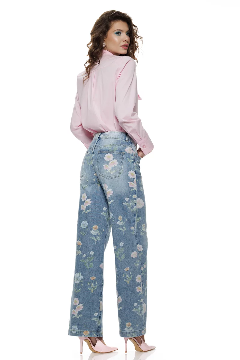 Un strop de primăvară, purtat în fiecare zi. Acești blugi wide premium transformă denimul clasic într-o piesă statement delicată, datorită imprimeului floral pastelat, discret și feminin. Croiul amplu, cu cădere lejeră, oferă confort maxim și creează instant un efect de alungire a siluetei – exact acel look modern, effortless chic.