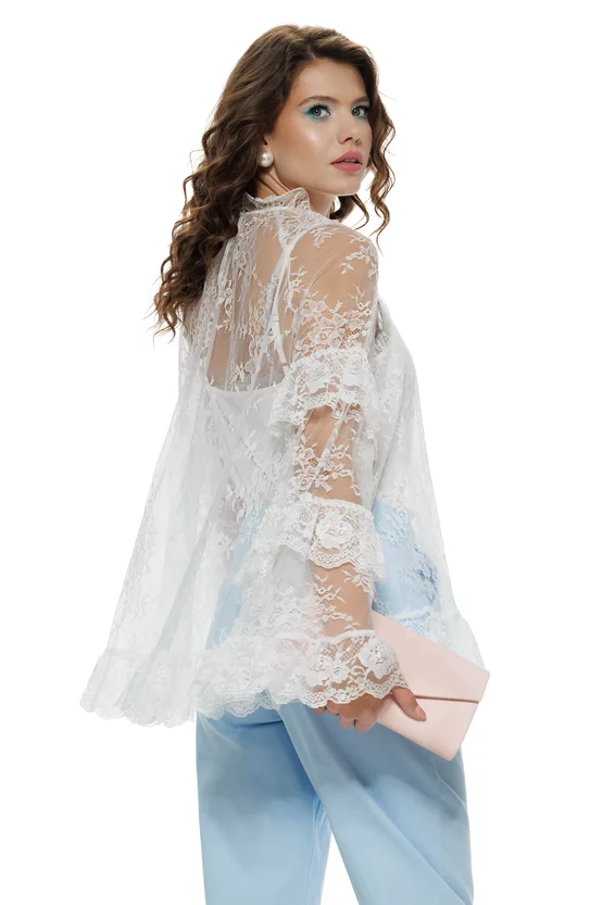 Romantică și sofisticată, bluza alba din dantelă premium este genul de piesă care atrage privirea prin delicatețe și detalii. Dantela fină, cu motiv floral, creează un efect diafan și elegant, iar volanele ușoare, amplasate la guler, manșete și tiv, adaugă volum subtil și feminitate. Pentru confort și un look impecabil, bluza vine cu maiou asortat, astfel încât transparența să rămână rafinată și perfect echilibrată.