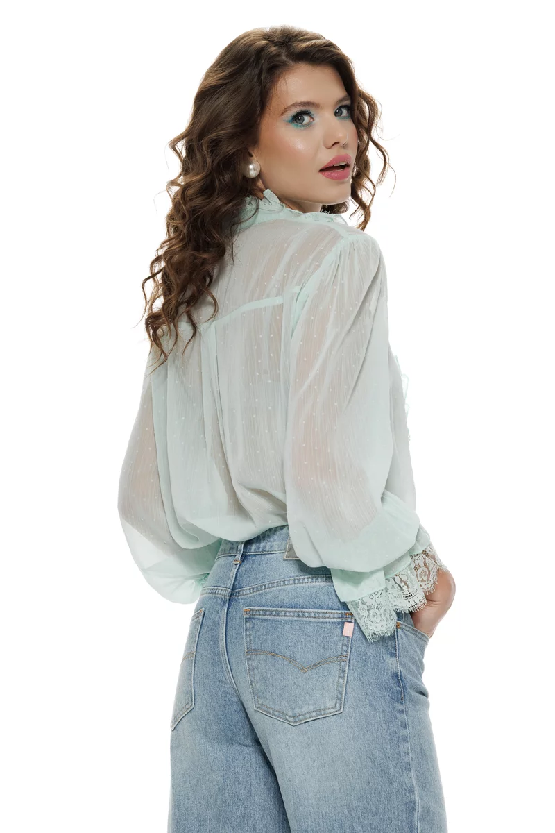 Această bluză aqua premium este definiția romantismului modern: diafană, fină și spectaculoasă prin detalii. Jaboul frontal creează un efect elegant, “statement”, iar volanele delicate completează look-ul cu o notă feminină, sofisticată. Manșetele sunt puse în valoare de inserții de dantelă, pentru acel finish rafinat care se vede imediat. Este genul de piesă care ridică instant o ținută simplă și te face să arăți impecabil, fără să încerci prea mult.