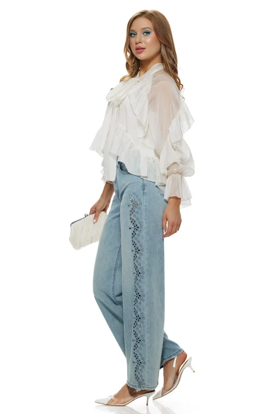 Diafană, sofisticată și spectaculoasă prin volum, bluza ivoire din organza fina este piesa care aduce instant un aer couture în orice ținută. Materialul ușor transparent creează o cădere delicată, iar volanele ample, etajate pe mâneci, oferă acel efect “statement” fără să pară încărcat. Detaliul vedetă este eșarfa lungă la gât, pe care o poți lega într-o fundă elegantă sau o poți lăsa lejer, pentru un look modern și rafinat.