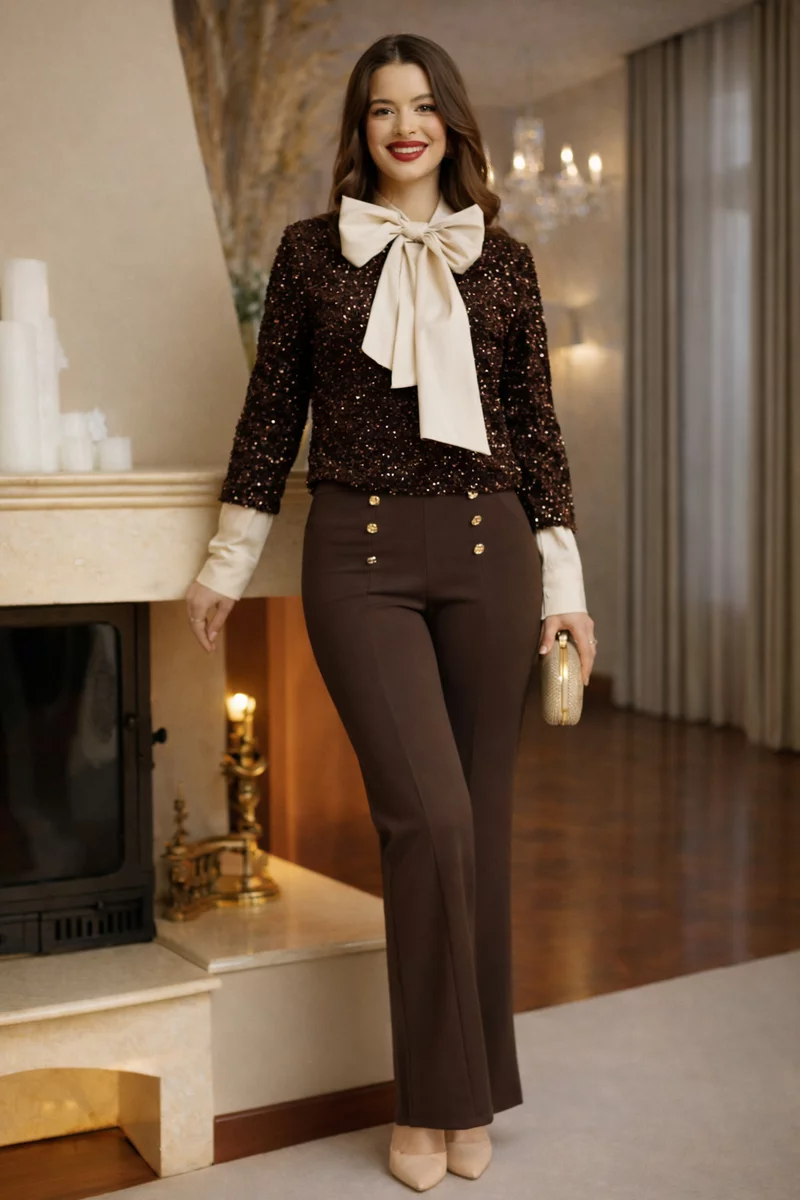Poart-o cu pantaloni eleganți, fuste conice sau fuste din piele ecologică pentru un contrast de texturi. Se potrivește perfect cu accesorii nude, aurii sau crem. Ideală pentru Crăciun, Revelion, petreceri, cocktail sau cine festive.