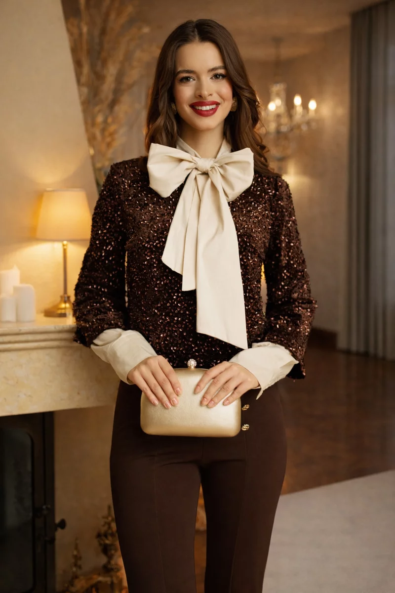 O bluză care surprinde perfect spiritul sărbătorilor: luxoasă, feminină și sofisticată. Catifeaua moale, îmbrăcată în paiete fine, creează un efect de strălucire subtilă, elegantă, fără exces. Nuanța profundă de maro ciocolată adaugă căldură și rafinament, transformând bluza într-o piesă statement, dar ușor de purtat.