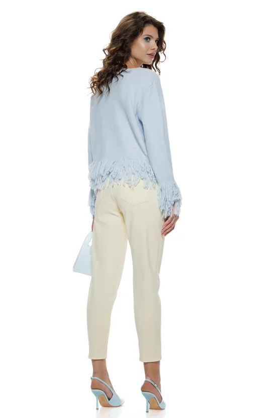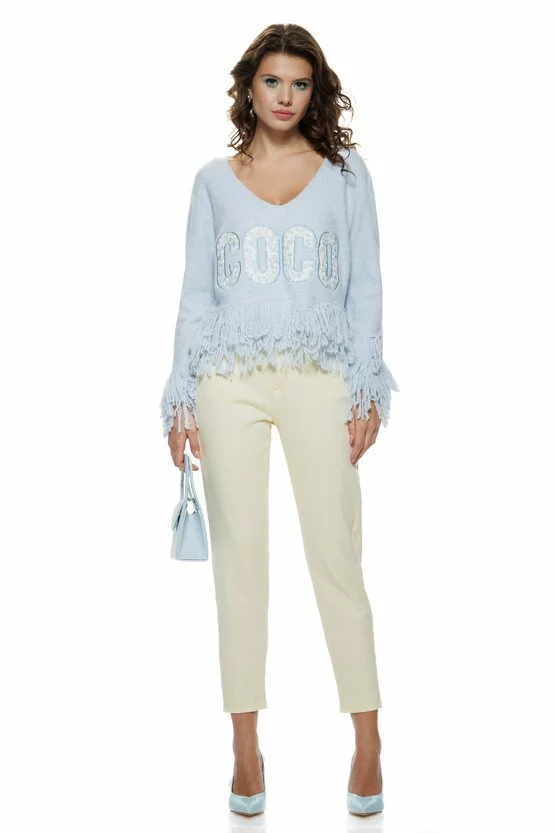 Această bluză este definiția rafinamentului relaxat — moale, delicată și extrem de feminină. Tricotul premium îmbrățișează plăcut pielea, în timp ce broderia florală „COCO” adaugă un accent sofisticat și modern. Franjurii fini de la bază creează mișcare și stil, transformând orice ținută într-una cu personalitate. Este piesa perfectă pentru femeia care vrea confort fără să renunțe la eleganță.