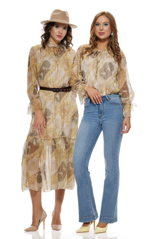 Imprimeul artistic în tonuri pastel oferă un look boem modern, în timp ce gulerul cu volănașe și șnur decorativ adaugă un accent feminin rafinat. Mânecile lungi, lejere, completează armonios designul, fiind ideale atât pentru ținute de zi elegante, cât și pentru apariții speciale.