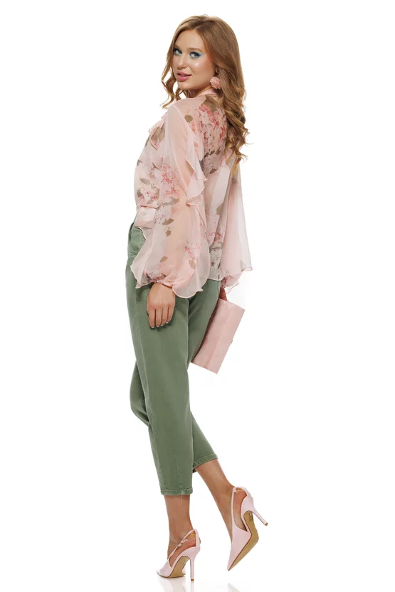 Bluza dama eleganta din voal matasos roz imprimeu floral cu volanase romantice