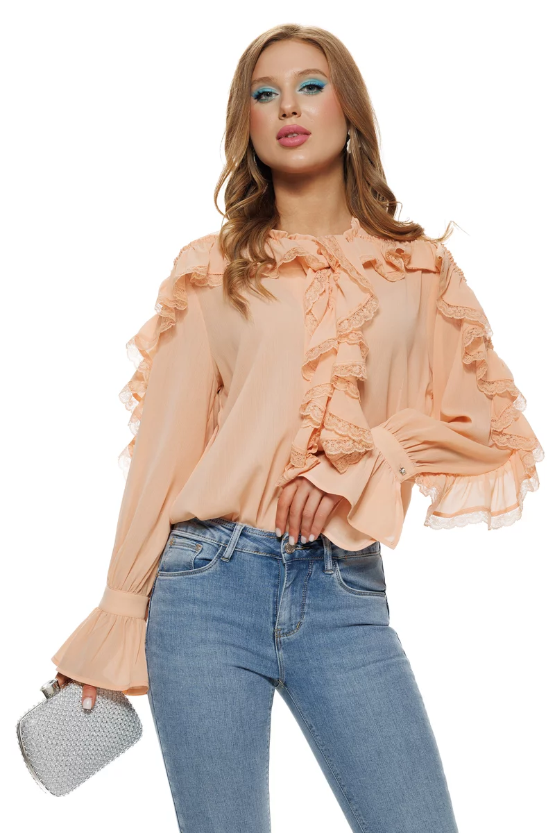 O bluză care emană feminitate pură și eleganță romantică. Tonurile calde de piersică, se așază superb pe piele și aduce lumină întregii ținute. Volanele ample, dispuse în cascadă și conturate de dantelă fină, creează un efect spectaculos și rafinat, ca o bijuterie textilă.