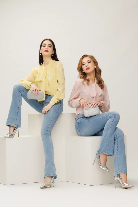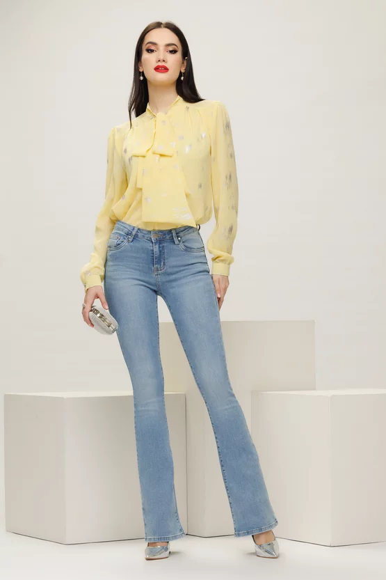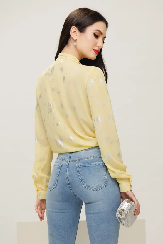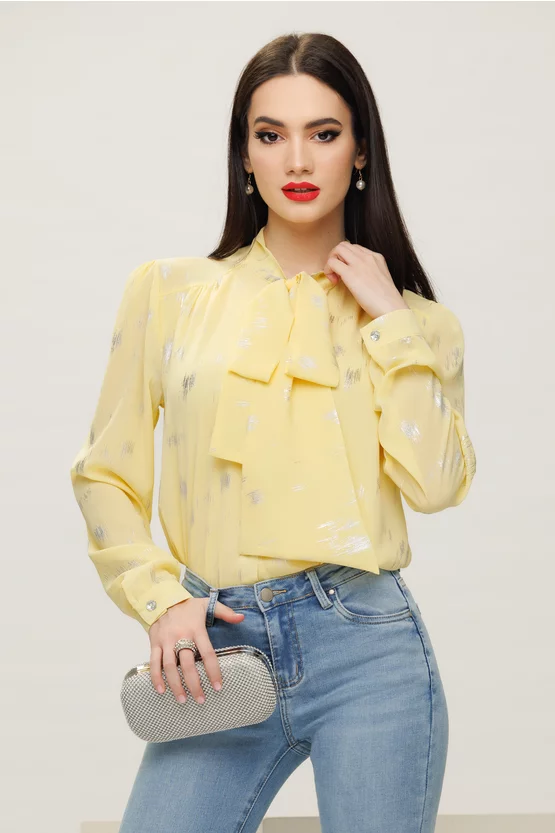 Bluza dama eleganta Fofy galbena cu imprimeu argintiu si esarfa innodata