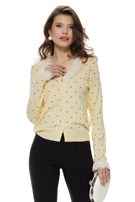 Bluza dama eleganta galben cu buline din vascoza premium cu contururi din dantela si nasturi perla