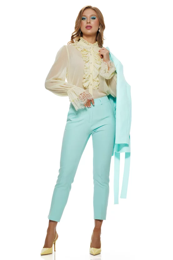 Această bluză galbena premium este definiția romantismului modern: diafană, fină și spectaculoasă prin detalii. Jaboul frontal creează un efect elegant, “statement”, iar volanele delicate completează look-ul cu o notă feminină, sofisticată. Manșetele sunt puse în valoare de inserții de dantelă, pentru acel finish rafinat care se vede imediat. Este genul de piesă care ridică instant o ținută simplă și te face să arăți impecabil, fără să încerci prea mult.