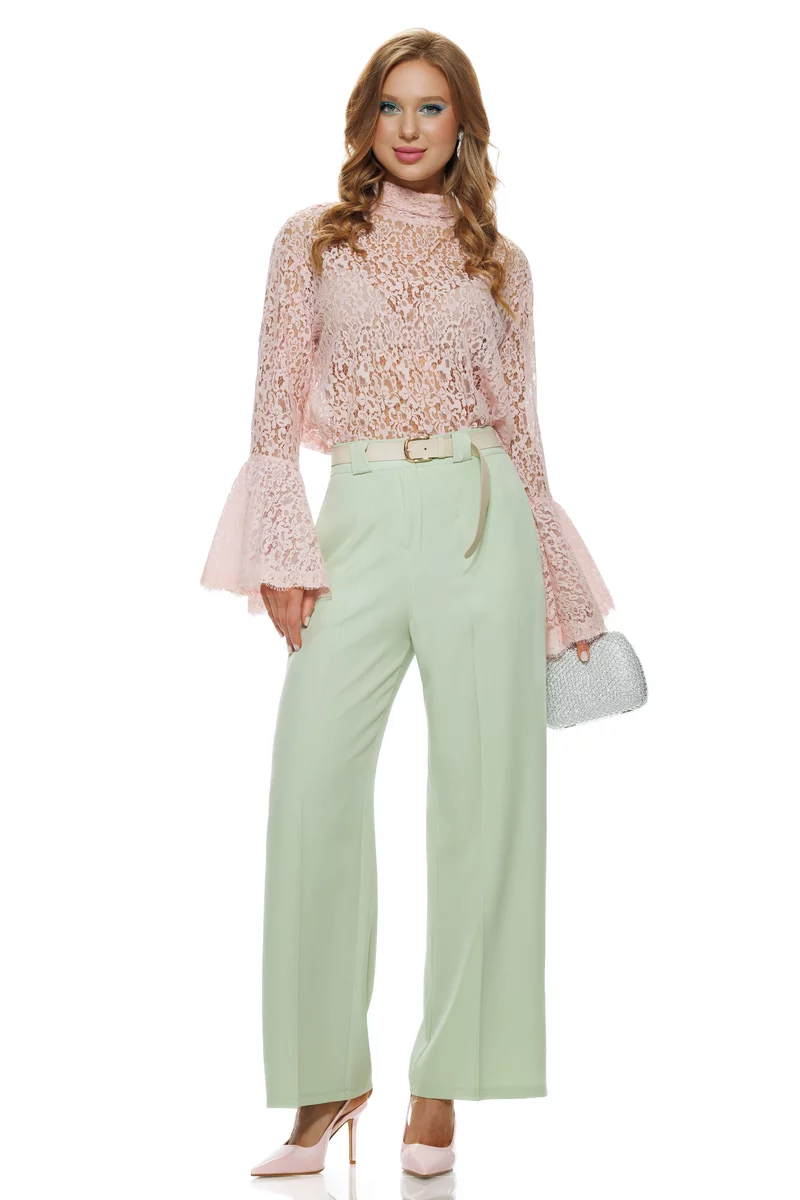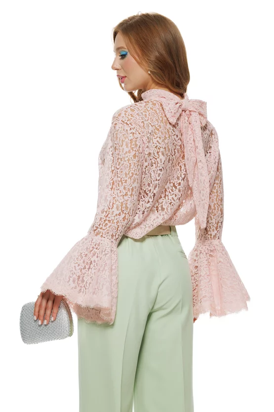 Bluza dama eleganta roz din dantela premium de bumbac cu volane si esarfa innodata