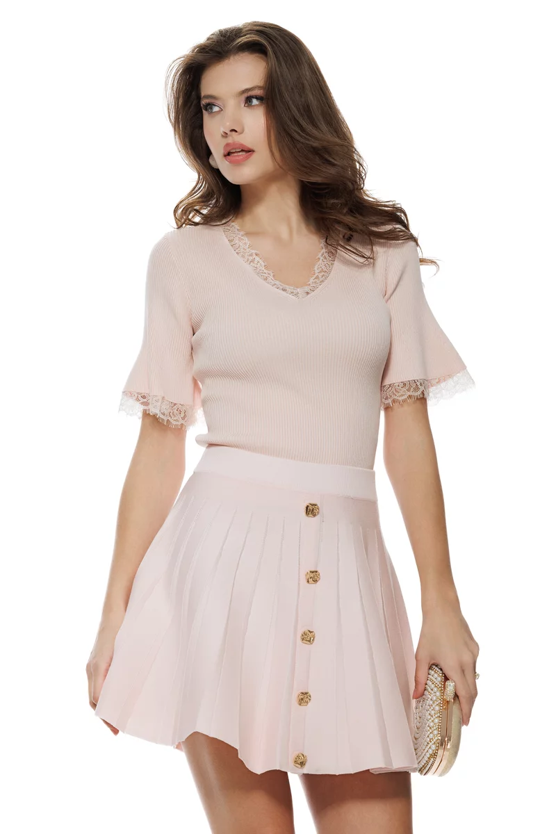 Bluza dama eleganta roz din vascoza premium cu contururi din dantela fina
