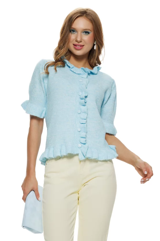 O bluza care aduce prospețime și feminitate în garderoba ta. Nuanța delicată de baby blue oferă un aer luminos și jucăuș, iar textura pufoasă, moale la atingere, creează senzația de confort luxos. Volanele romantice de pe linia nasturilor și tivul cu finisaj ondulat transformă acest cardigan într-o piesă statement, perfectă pentru femeia care iubește detaliile fine și stilul delicat.
