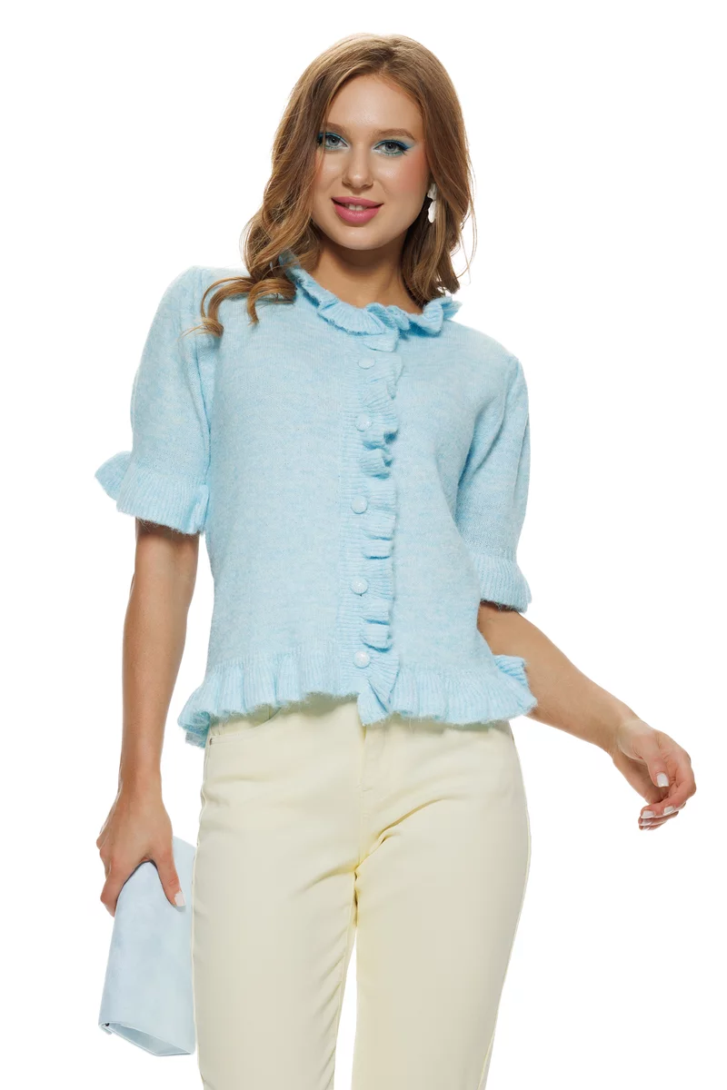 Bluza dama tricotata baby blue premium cu volane romantice si nasturi in ton