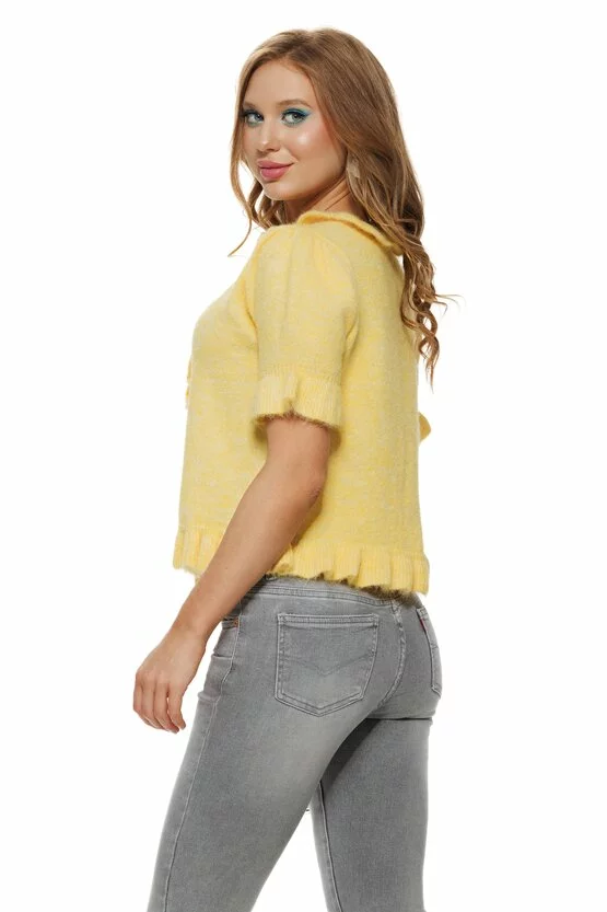 Bluza dama tricotata galben premium cu volane romantice si nasturi in ton