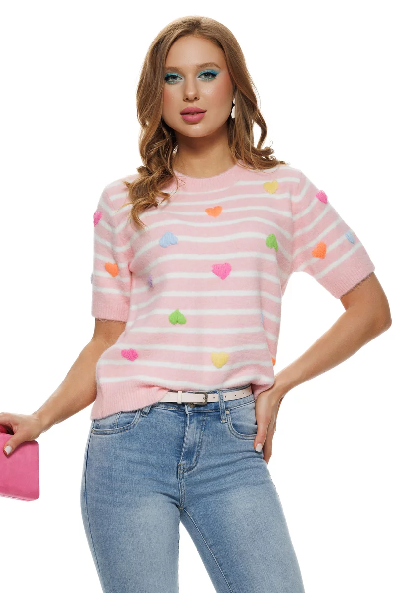Bluza dama tricotata roz premium cu inimioare brodate multicolore