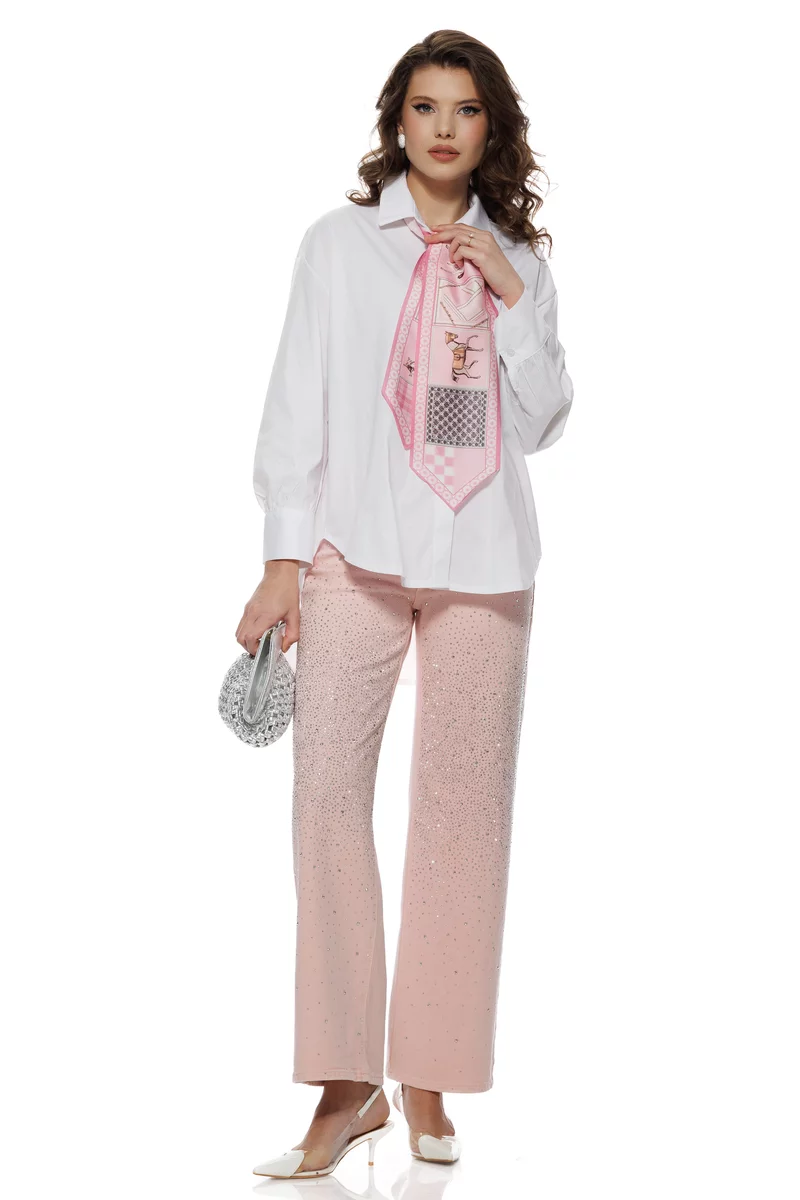 Poartă această cămașă cu jeanși în tonuri deschise, pantaloni eleganți albi, beige sau pastel, fuste midi fluide ori piese în nuanțe roz blue sau nude. Se potrivește perfect cu pantofi stiletto, slingback, loafers eleganți sau sandale fine. Pentru un look coerent și sofisticat, completează ținuta cu accesorii delicate și o geantă structurată în tonuri luminoase.