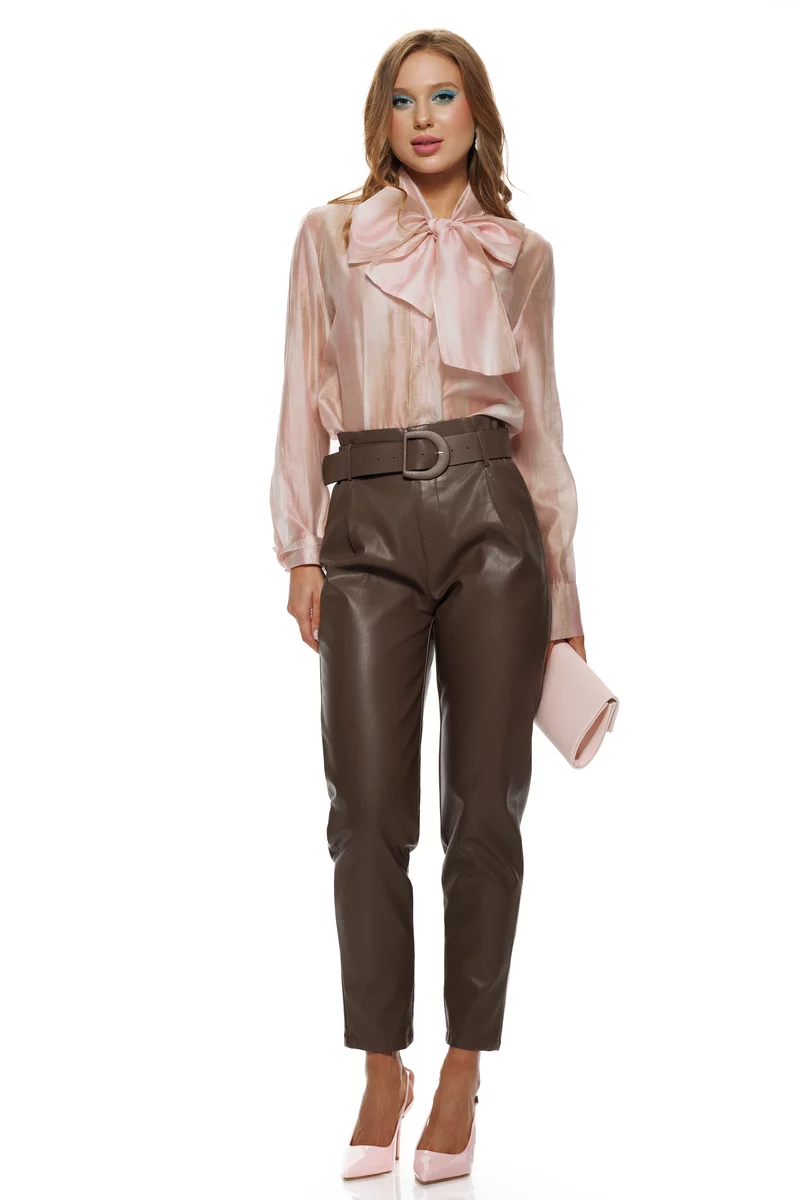 Cămașa elegantă cristal rose din organza de tencel impresionează prin finețea materialului, transparența delicată și jocul subtil de nuanțe în degrade, care oferă profunzime și rafinament fiecărei ținute. Designul este completat de o fundă maxi înnodată la gât, ce adaugă un aer romantic și sofisticat, perfect pentru apariții elegante.