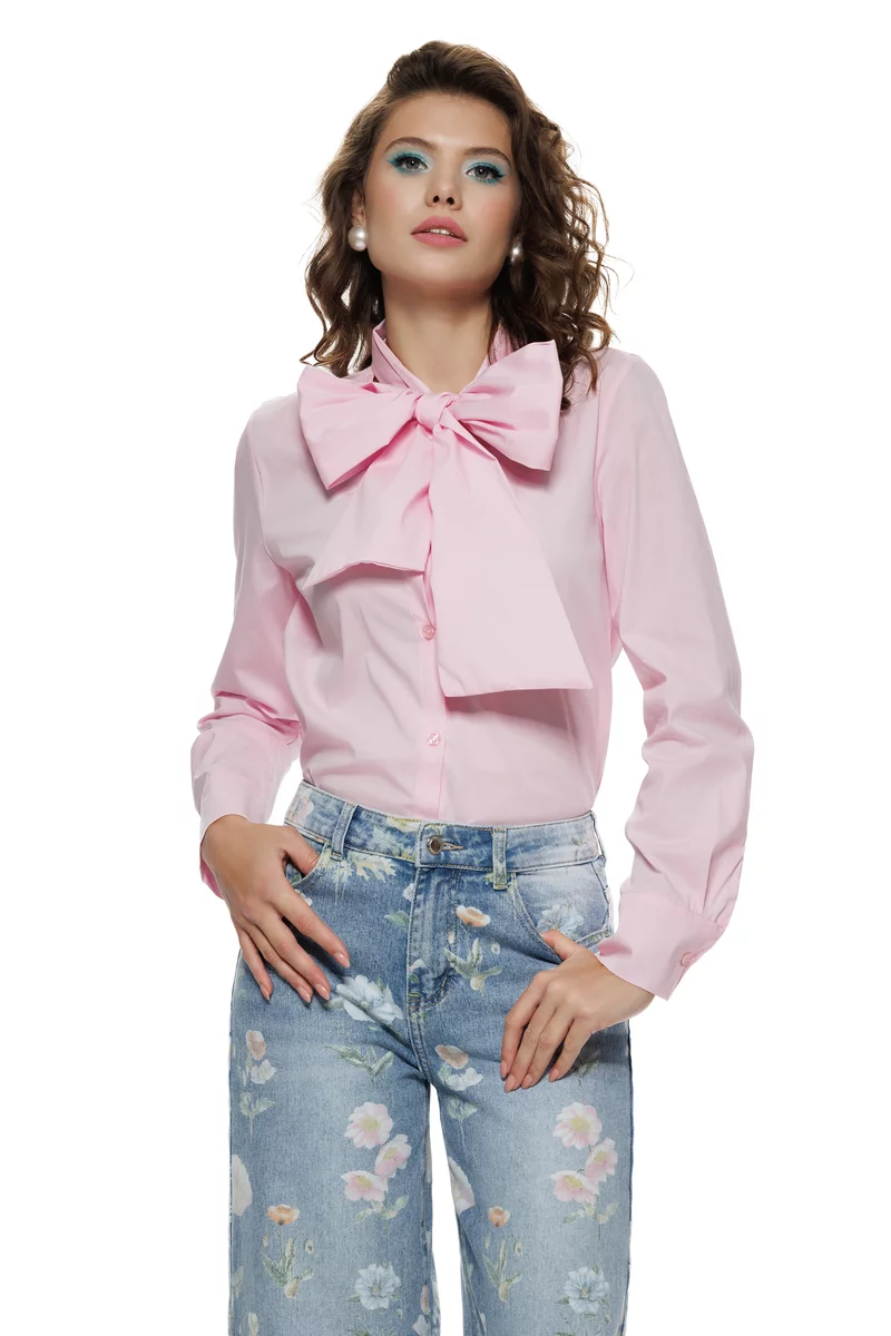 Această cămașă spectaculoasă în nuanța speciala de roz este piesa care transformă instant orice ținută într-una memorabilă. Realizată din bumbac cu aspect luxos, cămașa se remarcă prin fundă maxi supradimensionată, delicat arhitecturată, care devine centrul atenției și conferă un aer couture, perfect pentru evenimente, birou sau apariții fashion.
