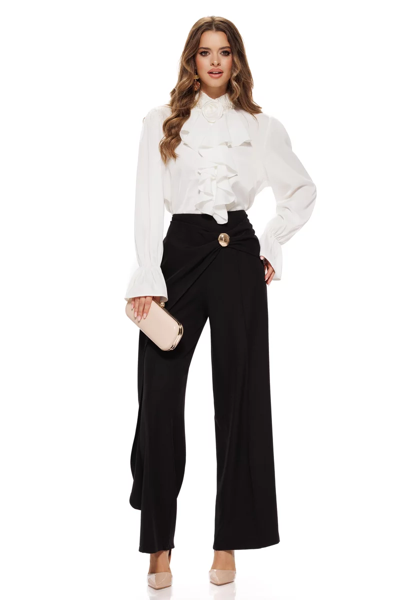 Alege această camasa alba cu volane și guler decorat cu perle și transformă orice apariție într-un moment de eleganță desăvârșită!