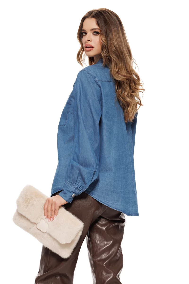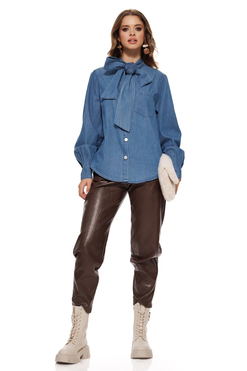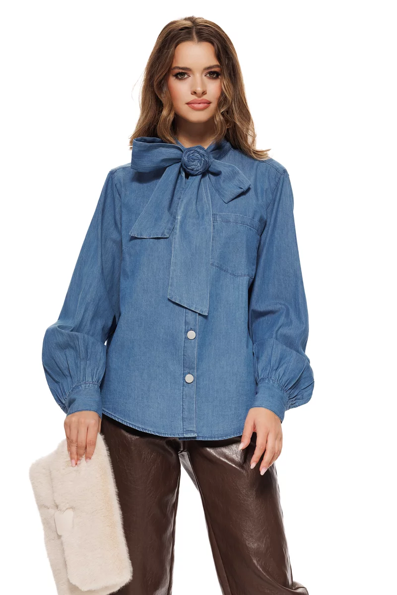 Această cămașă din denim albastru cu eșarfă la guler este o piesă versatilă și modernă, care aduce un aer sofisticat unei piese clasice. Confortabilă și stylish, poate fi purtată atât la birou, cât și în ținute casual de zi.