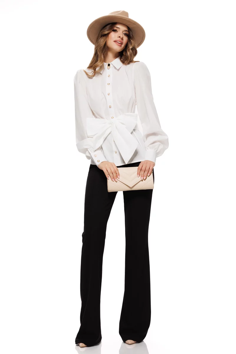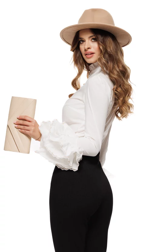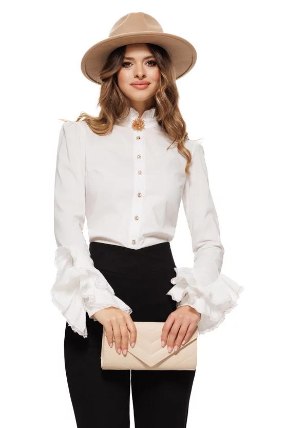 Camasa albă Fofy cu guler înalt, broșă decorativă și mâneci lungi cu volane clopot. Model elegant, cu nasturi ornamentali aurii, ideal pentru ținute office sau evenimente rafinate.