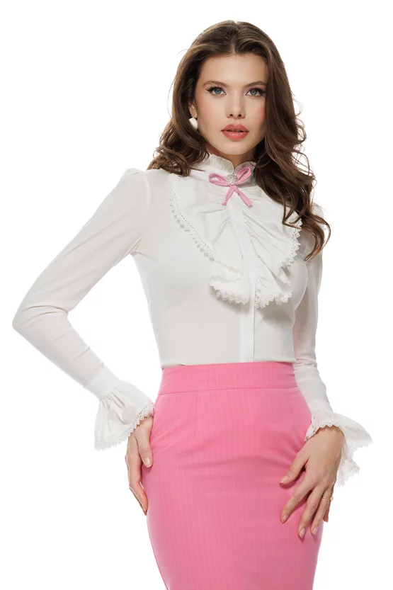 Camasa dama Fofy ecru premium cu jabou conturat cu dantela si fundita roz
