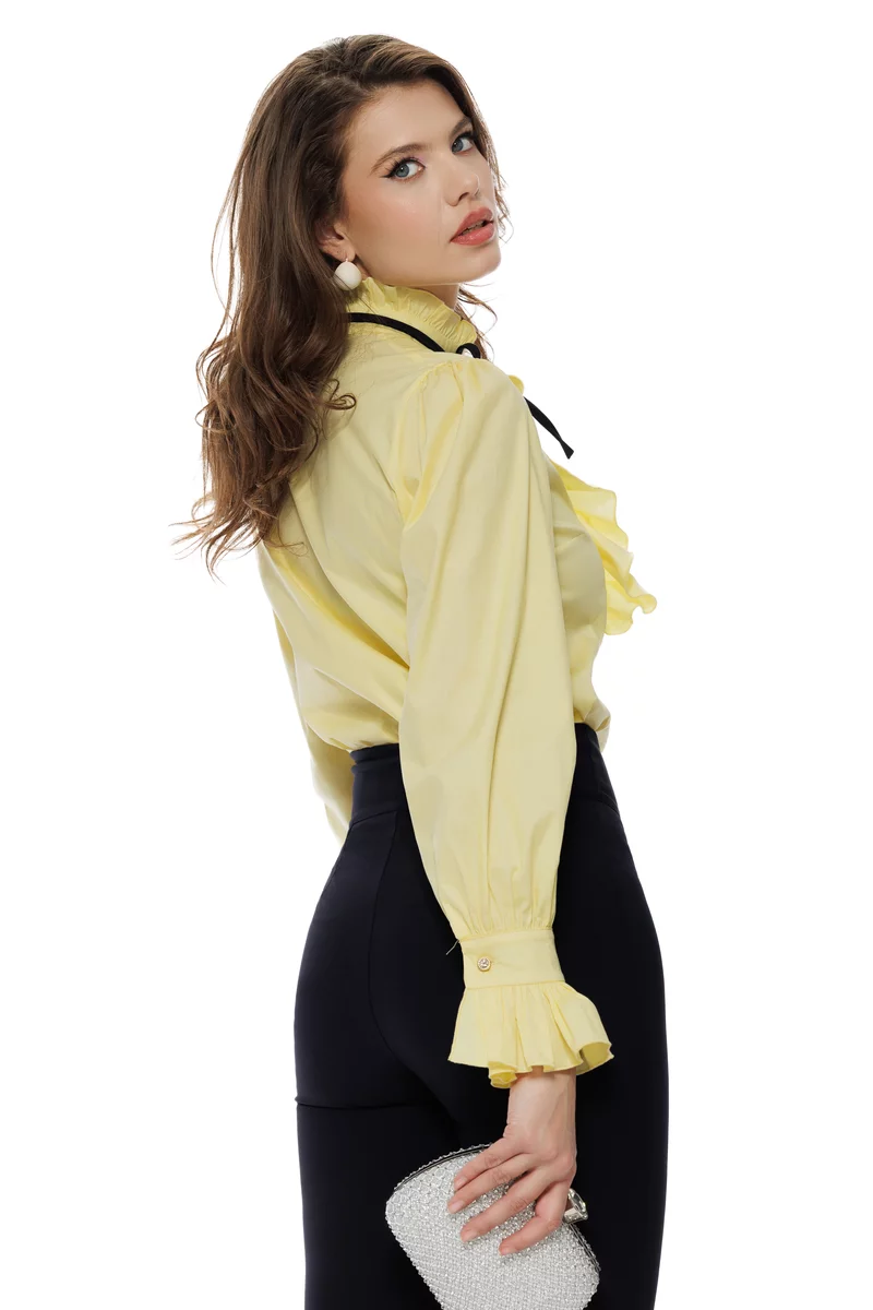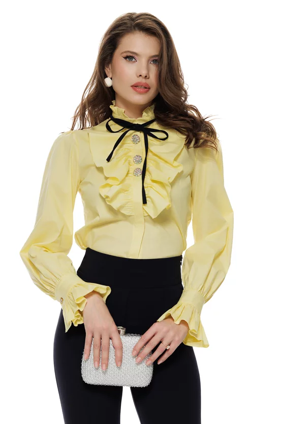 Această camasa galbena cu volane și nasturi bijuterie este creată pentru femeia care iubește rafinamentul și detaliile couture. Volanele ample si accesoriul de la gat conferă un aer aristocratic, perfect pentru ținute office elegante sau evenimente de zi.