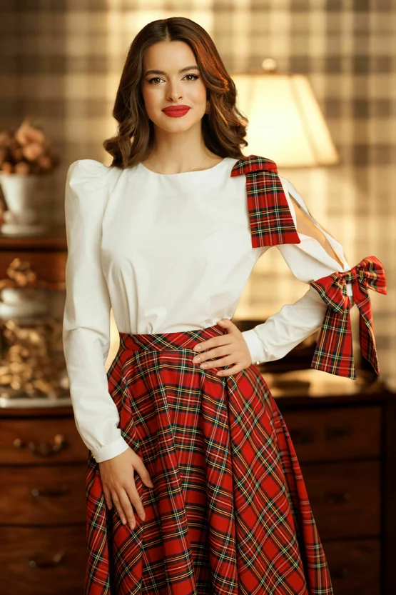 Camasa dama office Fofy din bumbac alba , maneca despicata si fundite in carouri