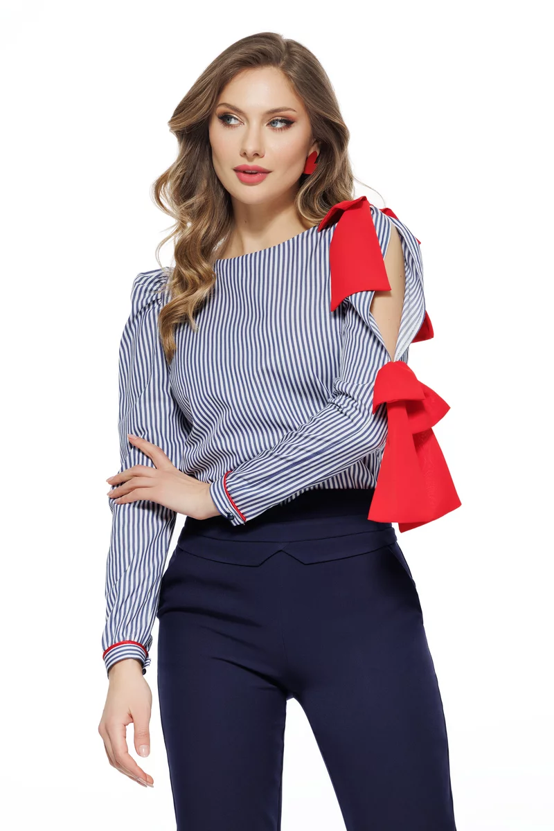 Camasa albastra din bumbac cu dungi albe și funde decorative la mâneci. O piesă fresh și feminină, ideală pentru ținute casual-chic sau office elegante.