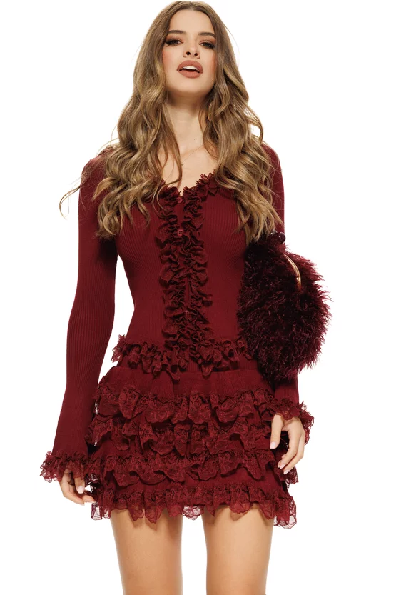 Compleu dama elegant din tricot bordo premium fusta mini si pulover cu volane dantela