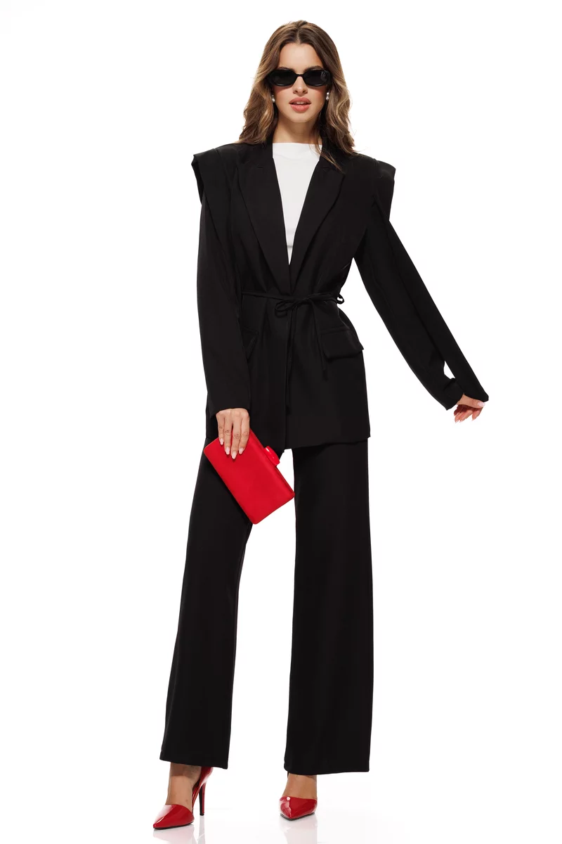Acest compleu negru cu sacou și pantaloni drepti talie inalta este alegerea perfectă pentru femeile care iubesc un look sofisticat și modern. Croiala cambrată a sacoului se îmbină armonios cu liniile fluide ale pantalonilor, creând o siluetă elegantă și rafinată.