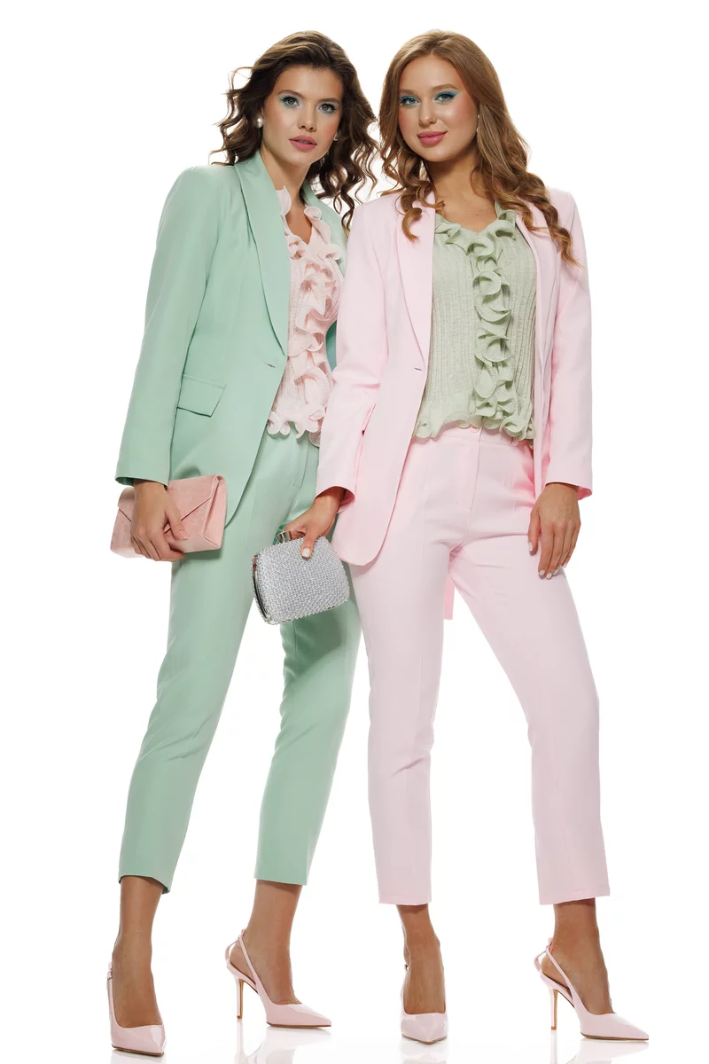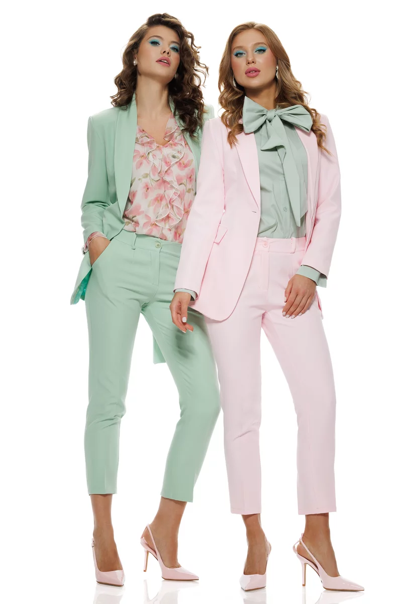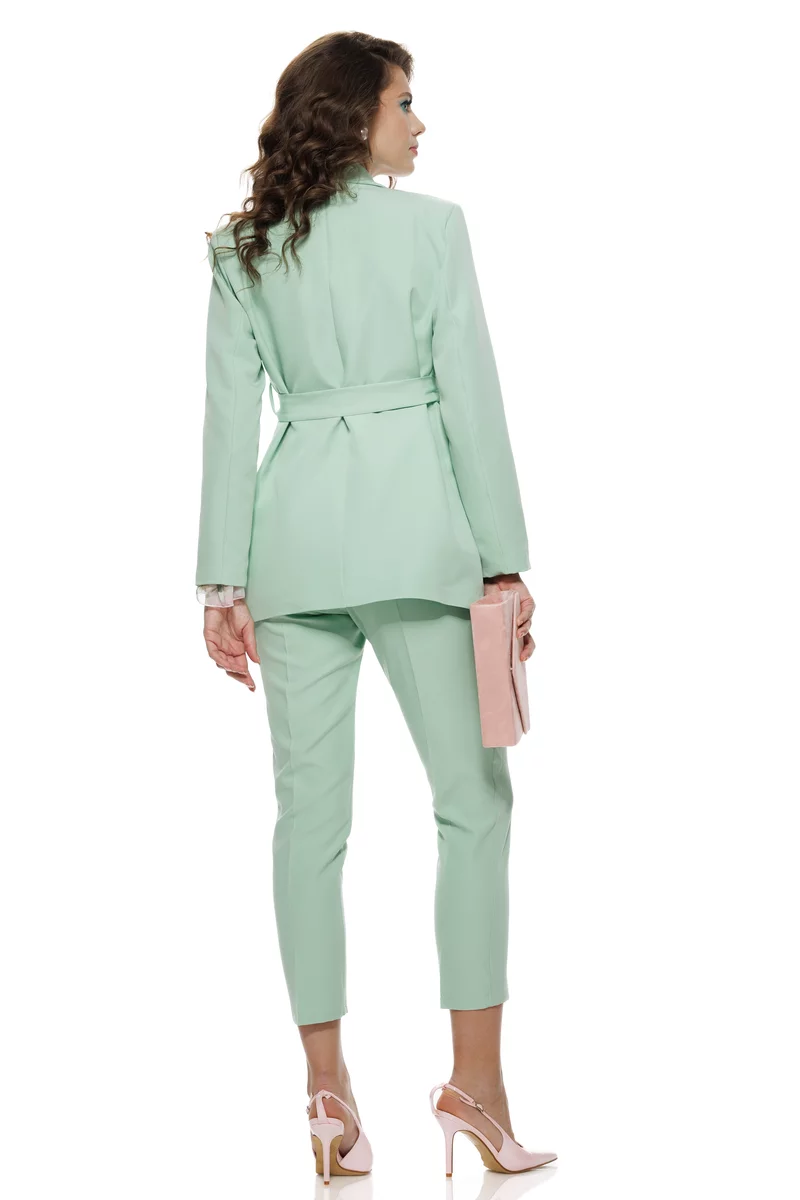 Delicat, feminin și impecabil croit, compleul verde menta este alegerea perfectă când vrei să arăți “aranjat” fără efort. Sacoul cu revere adaugă structură și eleganță, iar cordonul din talie subliniază frumos silueta. Pantalonul conic echilibrează proporțiile și oferă un look modern, curat, potrivit atât pentru zi, cât și pentru apariții de seară.