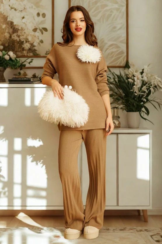 Alege acest compleu tricotat bej cu pantaloni drepti pentru un look elegant, natural și plin de confort zi de zi!