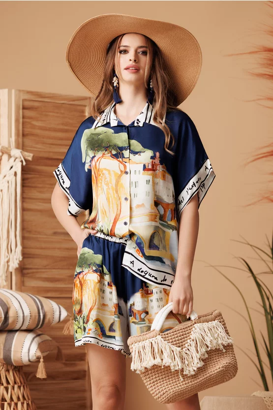 Compleu dama premium din matase naturala si vascoza satinata pantalon scurt si bluza imprimeu Portofino