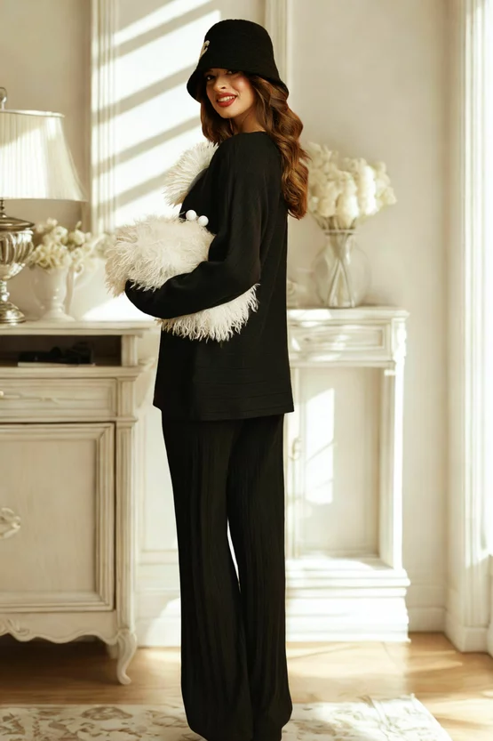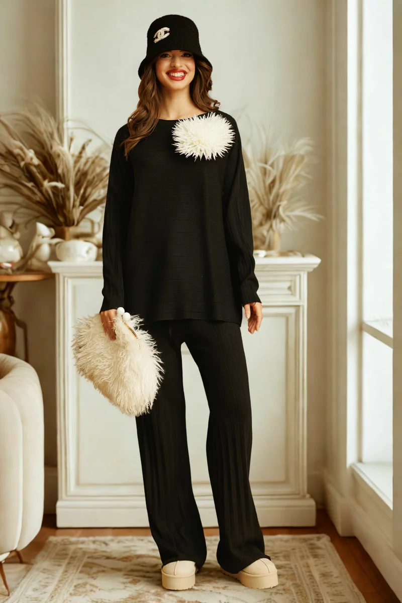 Alege acest compleu tricotat negru cu pantaloni drepti pentru un look elegant, natural și plin de confort zi de zi!