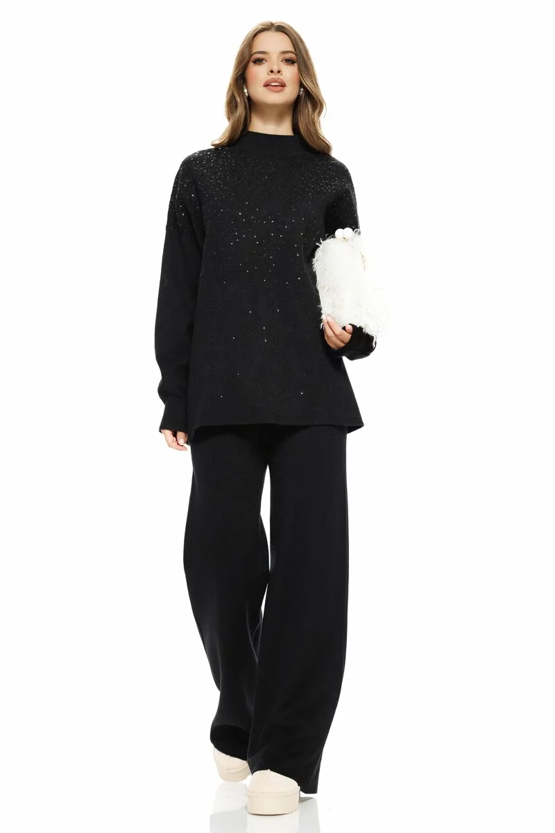 Compleu dama tricotat negru premium cu casmir pulover paiete fine si pantalon larg