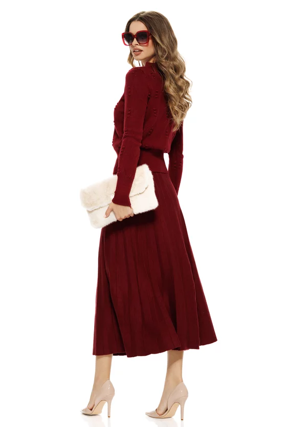 Compleu dama tricotat premium bordo cu fusta midi plisata si pulover cu buline structurate