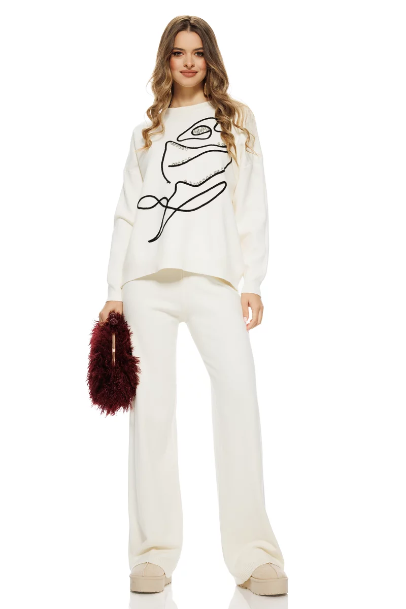 Compleu dama tricotat premium crem pantalon drept cu pulover trandafir stilizat cristale