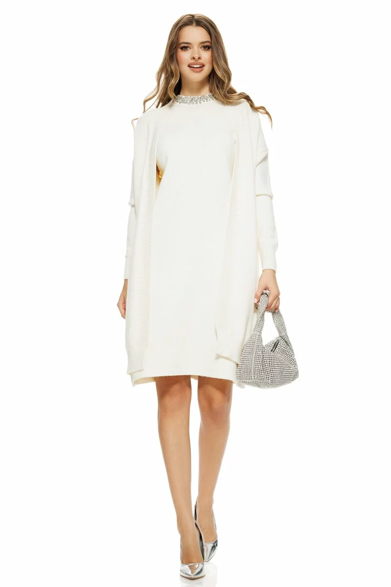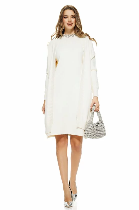 Compleu dama tricotat premium crem rochie cu cristale si cardigan