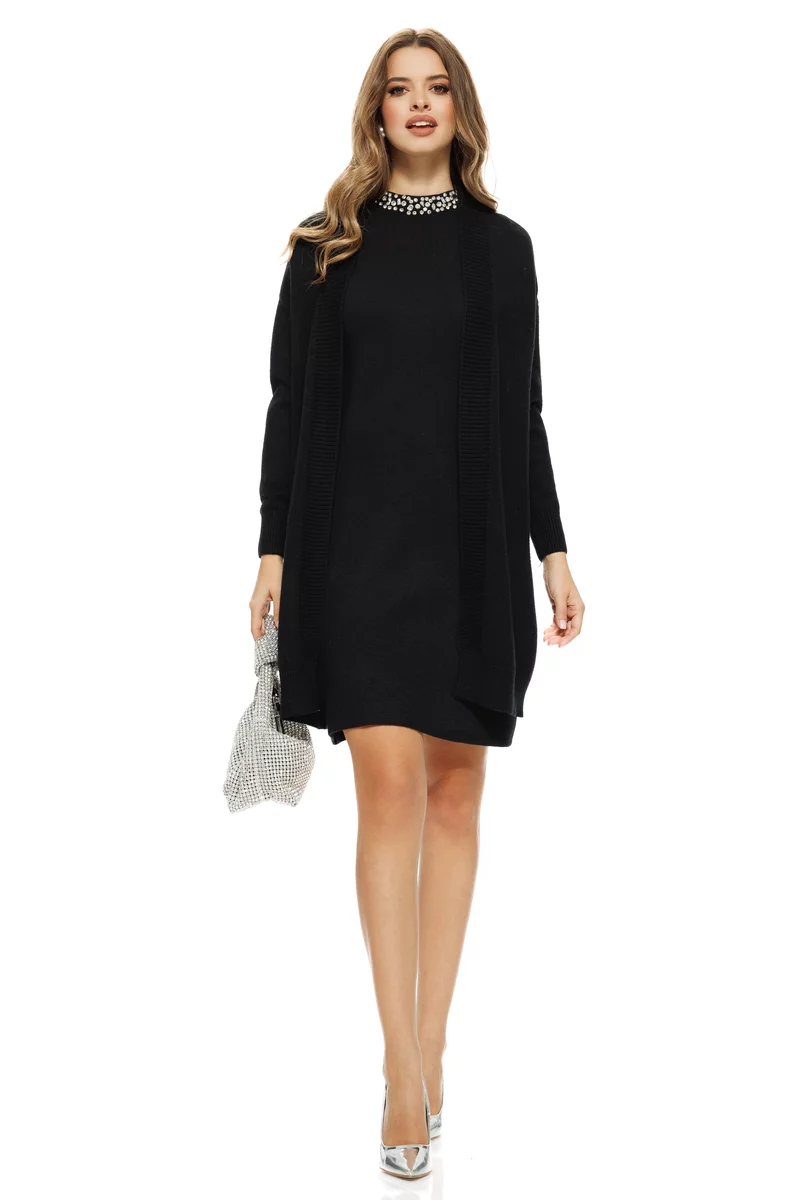 Compleu dama tricotat premium negru rochie cu cristale si cardigan