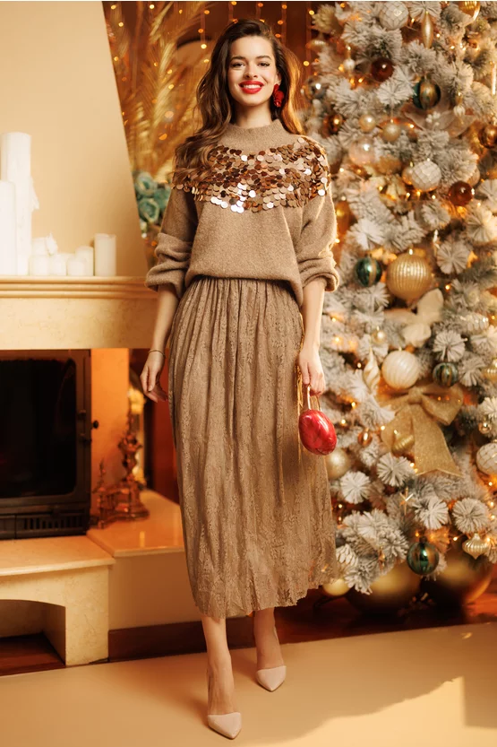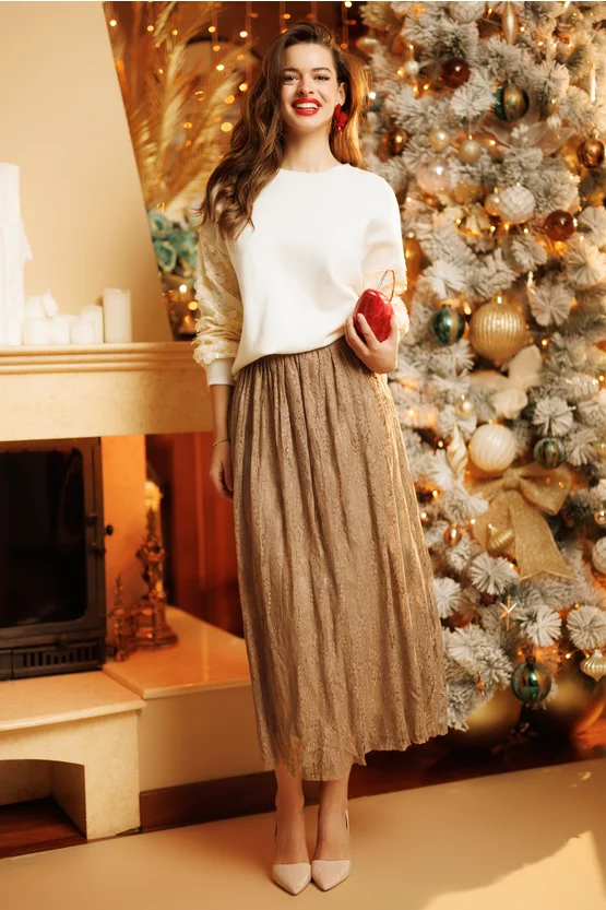 O fustă care emană eleganță naturală și rafinament discret. Dantela premium, îmbogățită cu o strălucire fină, creează un efect sofisticat și feminin, perfect pentru apariții delicate și memorabile. Nuanța bej cald adaugă luminozitate și versatilitate, iar croiul midi conferă echilibru și grație fiecărei mișcări.