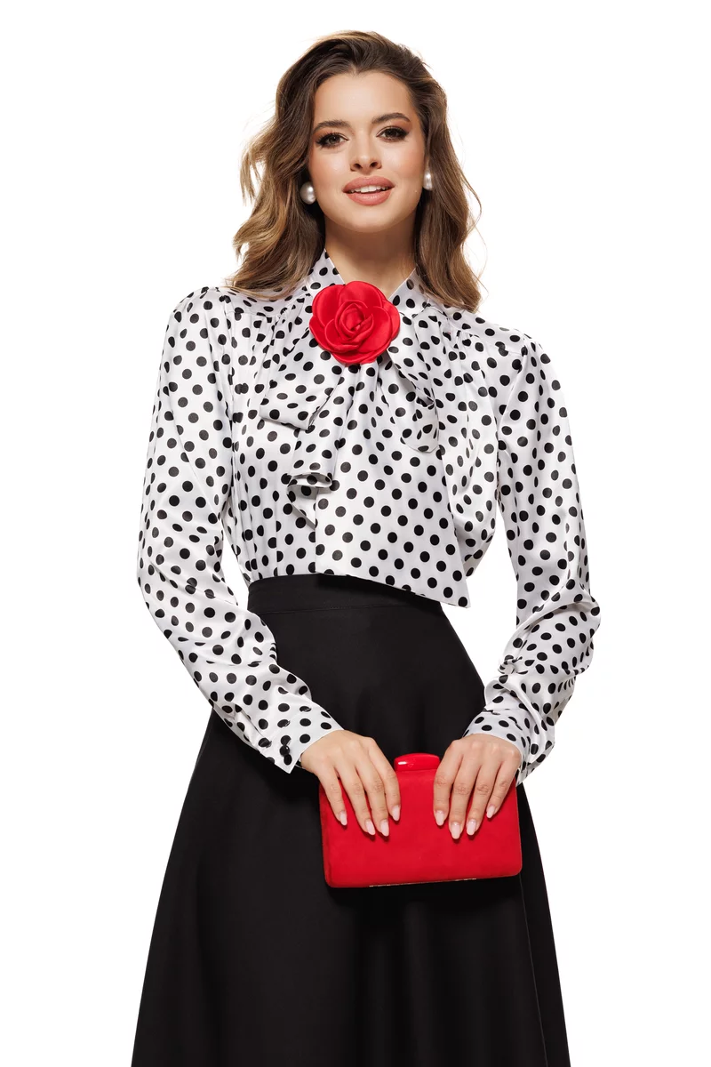 - Poart-o cu o bluză elegantă cu buline sau fundă, pentru un look clasic și sofisticat