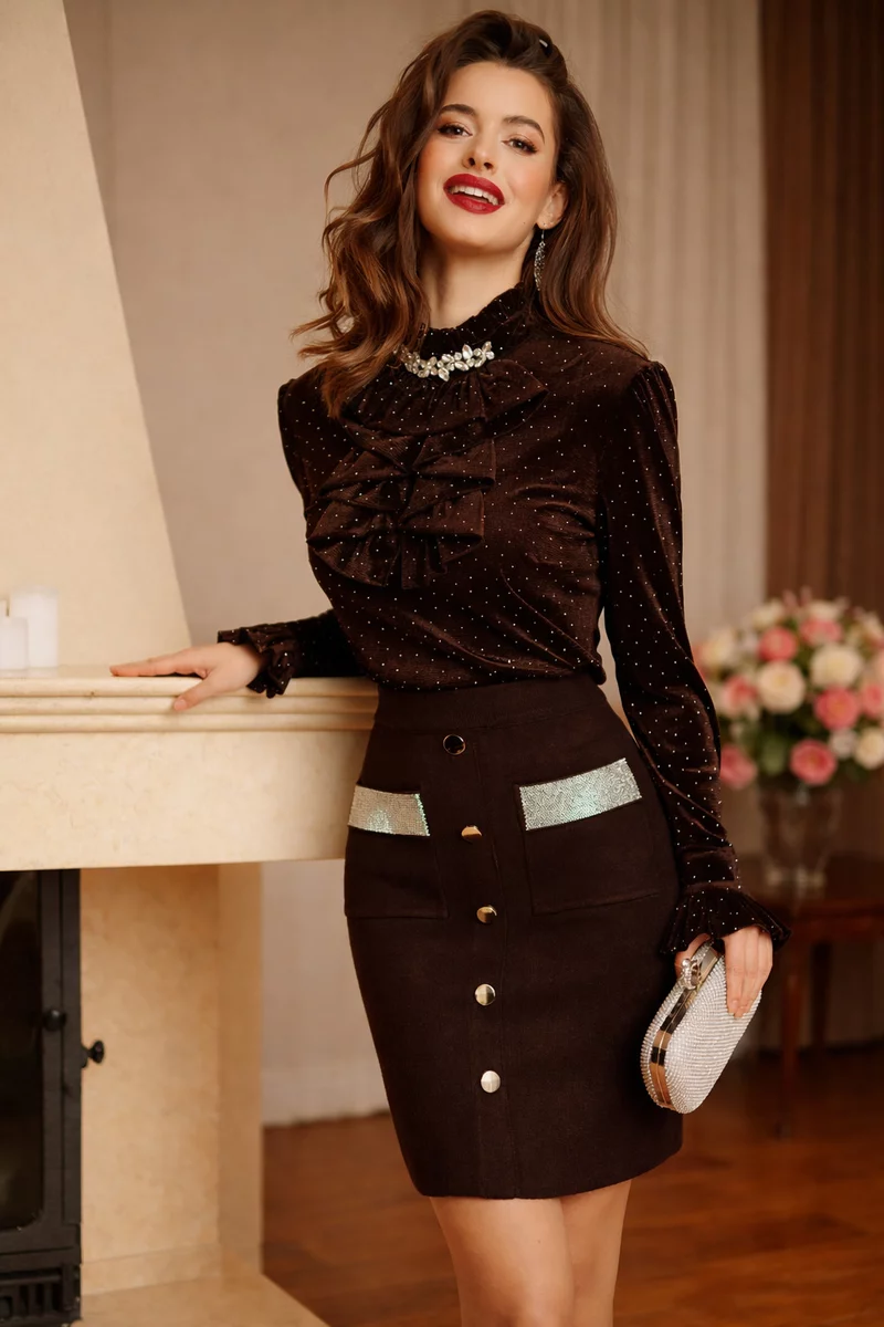 Adaugă un strop de culoare sofisticată în garderoba ta cu această fustă maro cu detalii aurii, ideală pentru femeia modernă care iubește eleganța subtilă.