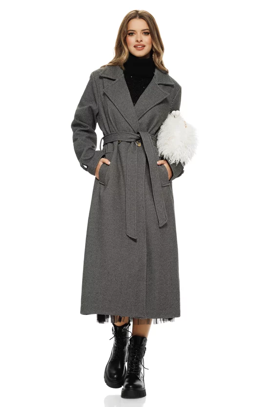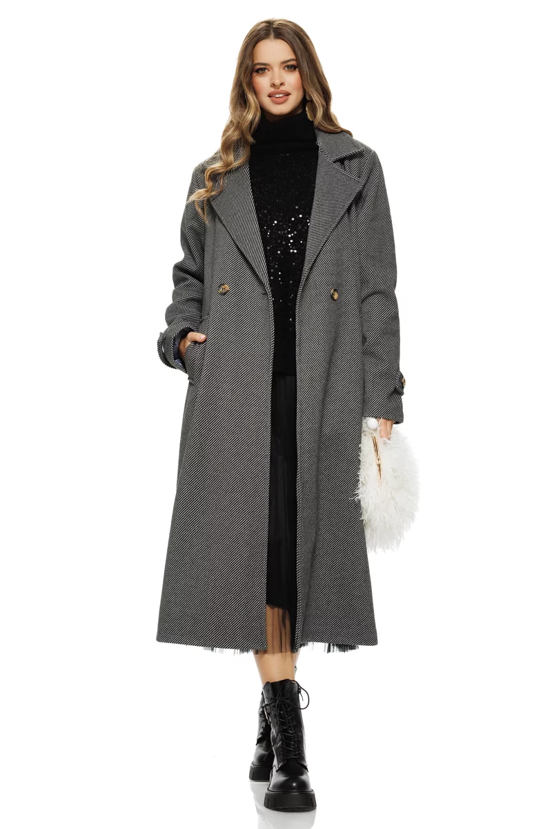Acest palton elegant negru-gri te va cuceri prin rafinamentul și versatilitatea sa. Croiul cambrat pune în valoare talia, iar cordonul ajustabil accentuează silueta feminină. Materialul cu textură diagonală și dungi fine oblice oferă o notă de distincție, iar reverele ample și nasturii metalici adaugă un aer modern și sofisticat.