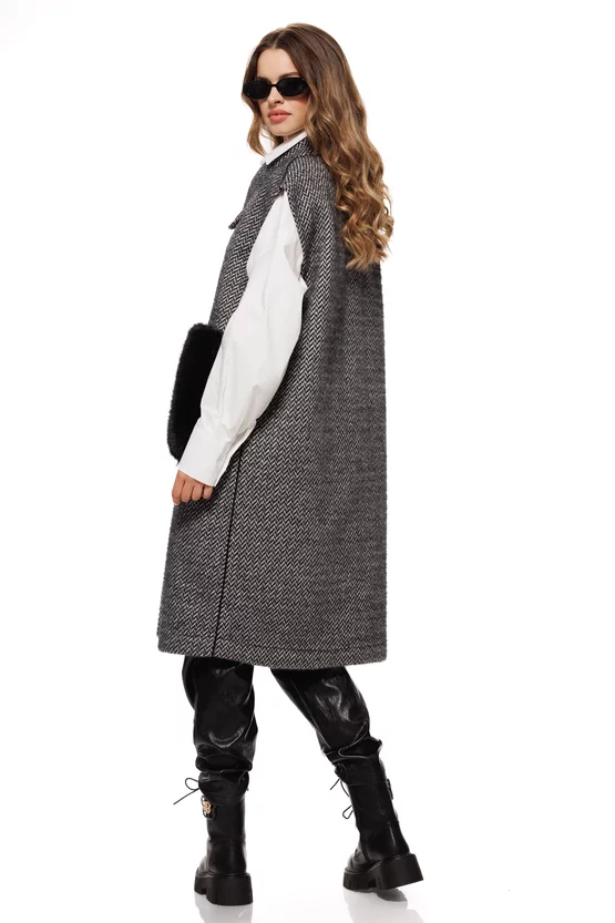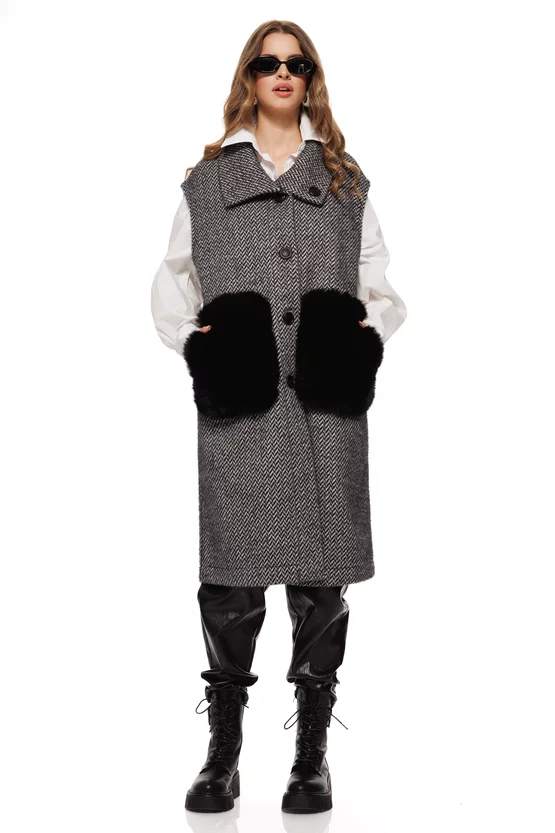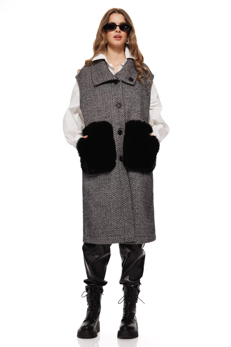 Vestă lunga elegantă, cu doua fete, în nuanțe negru-alb, cu imprimeu herringbone și buzunare maxi din blană eco. Perfectă pentru layering sofisticat de toamnă-iarnă.