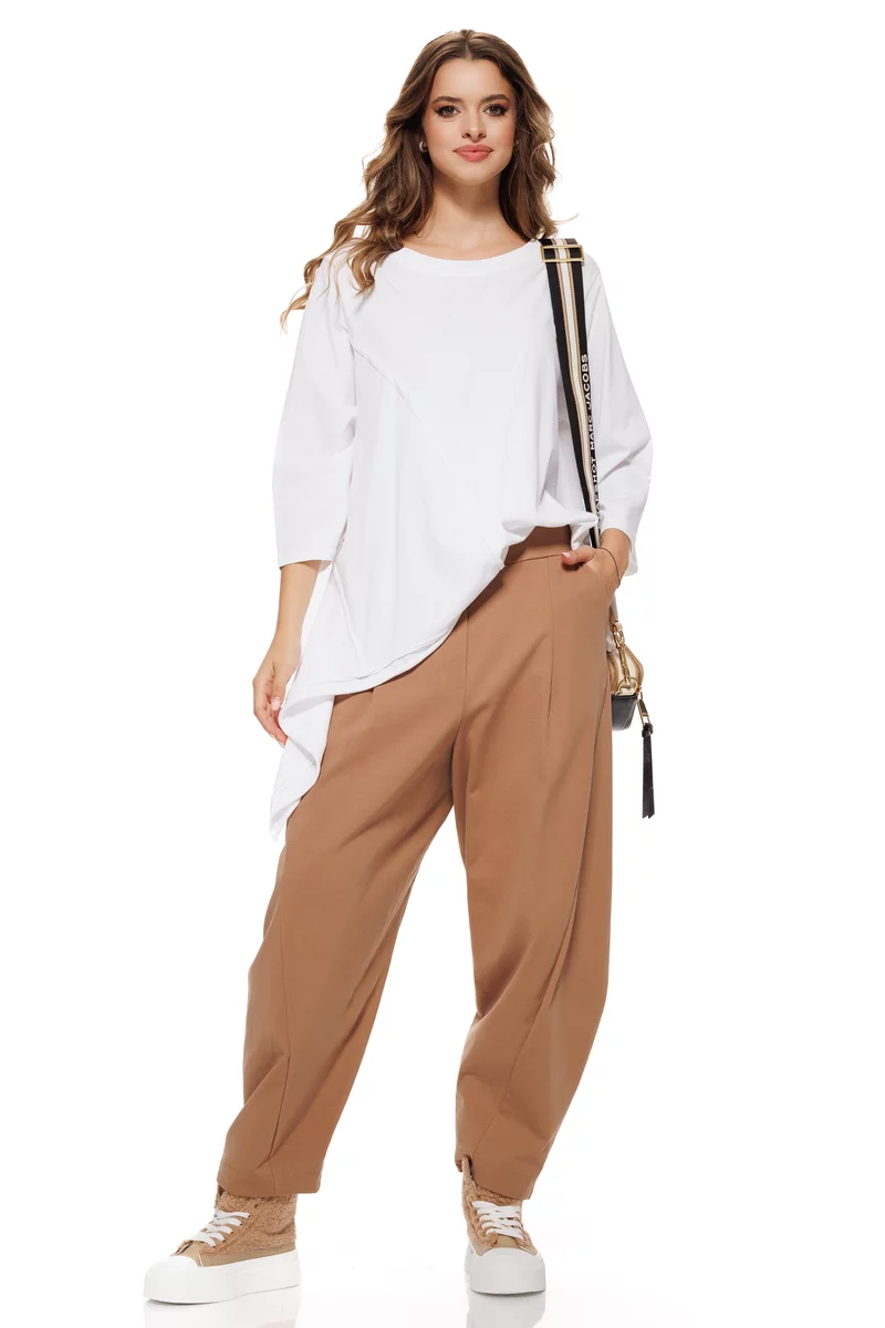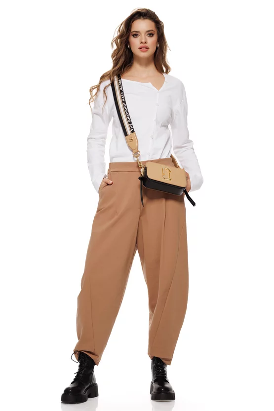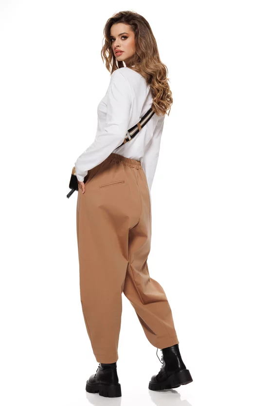 Eleganță și confort într-o singură piesă – acești pantaloni mocca mouse cu croială conică sunt alegerea ideală pentru femeile moderne care caută o ținută practică și rafinată. Acesti pantaloni îmbină un design modern cu lejeritatea taliei elastice, pentru un plus de libertate la purtare.
