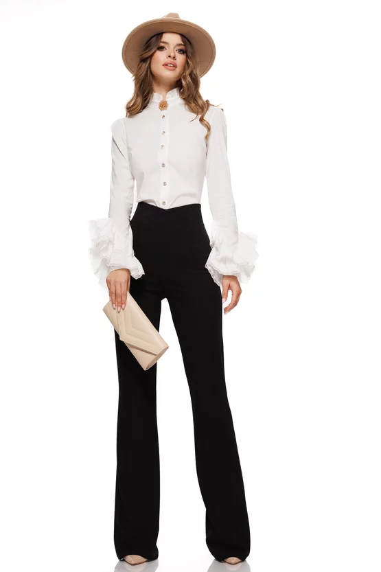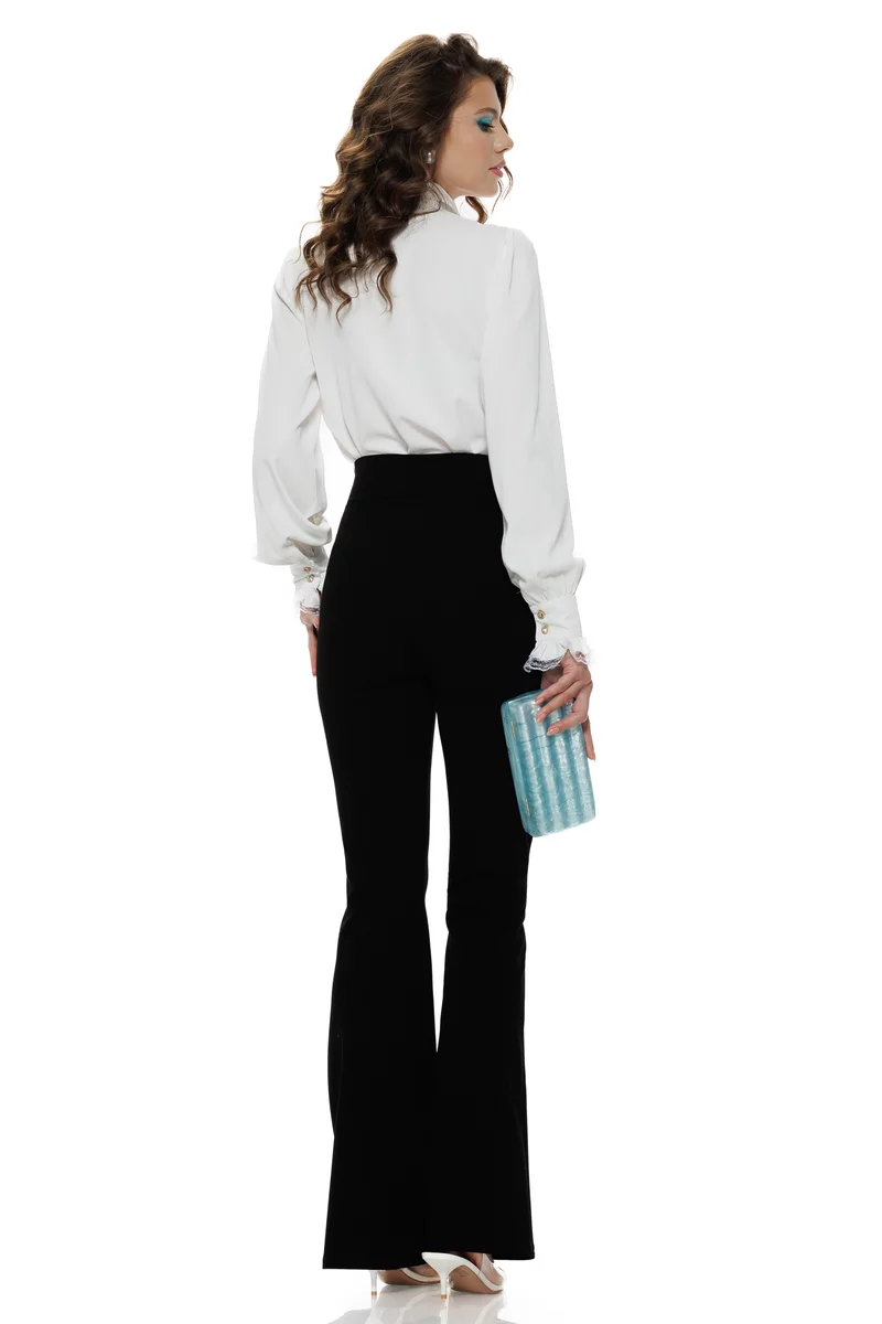 Alege acești pantaloni negri evazați cu talie înaltă și bucură-te de o siluetă elegantă și rafinată la fiecare purtare!