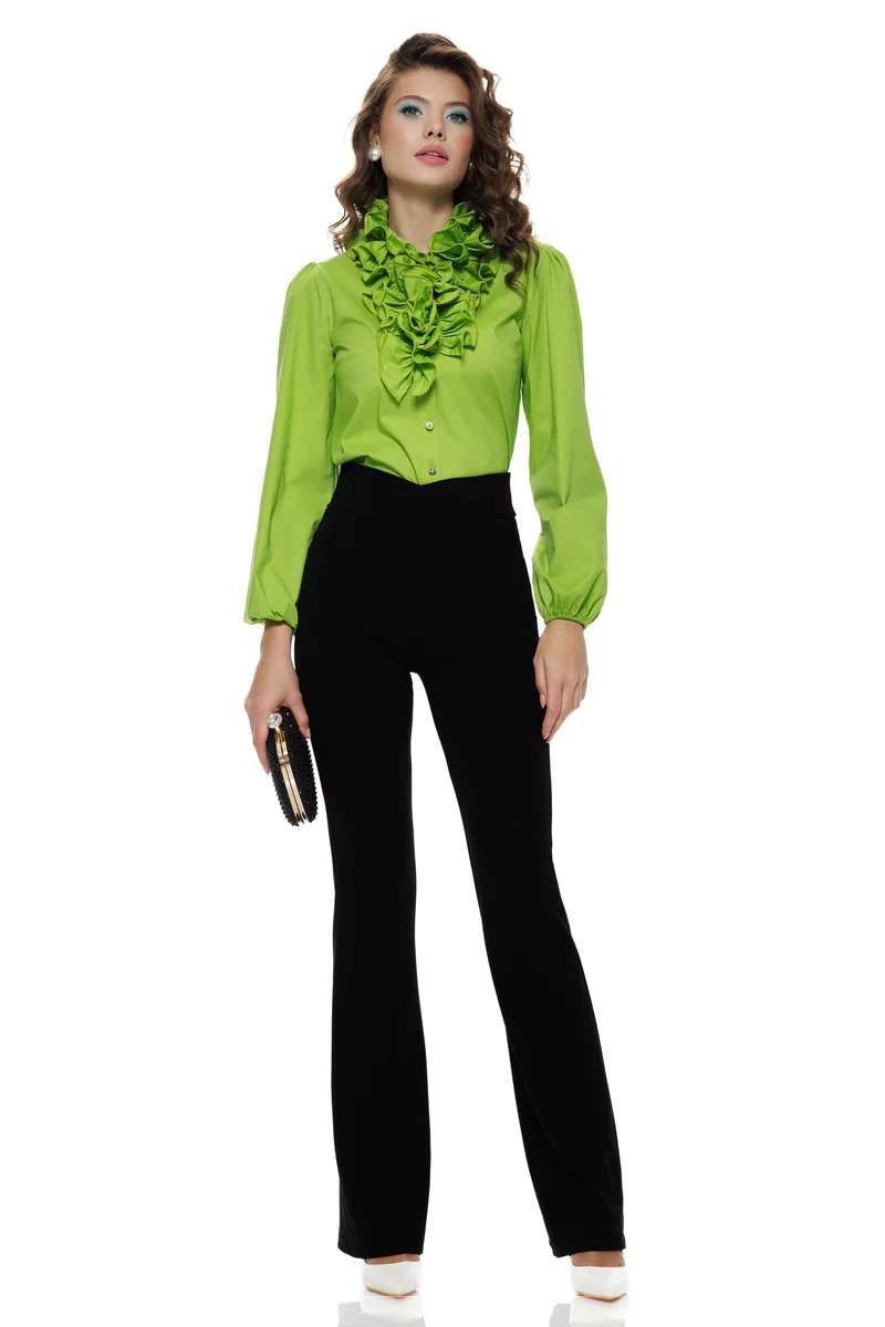 Acești pantaloni negri evazați cu talie înaltă sunt creați pentru a evidenția eleganța naturală și feminitatea modernă. Croiala parte peste parte subliniază talia și creează un efect optic de alungire, iar materialul elastic asigură confort pe tot parcursul zilei.